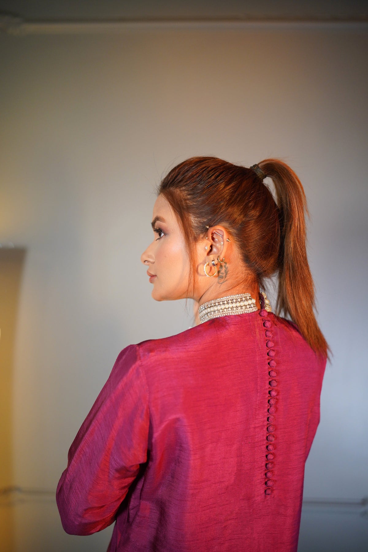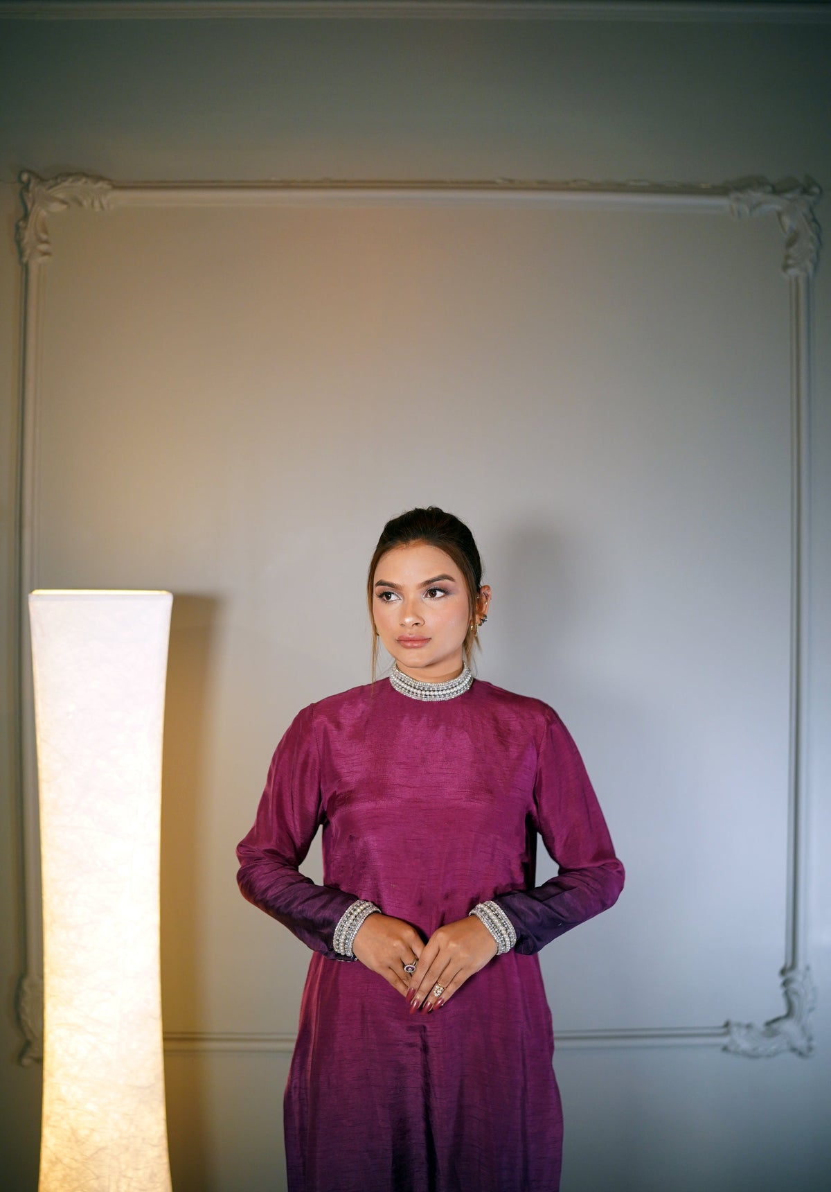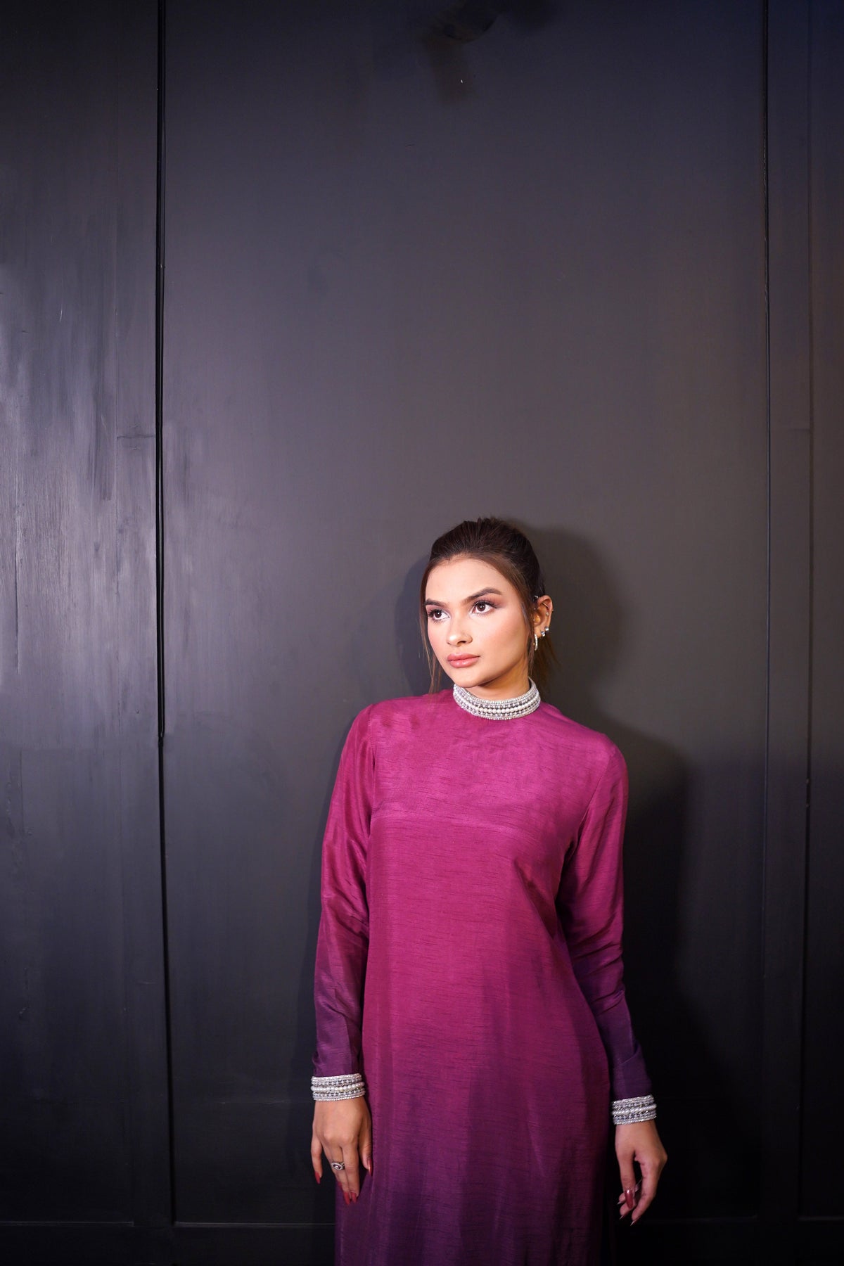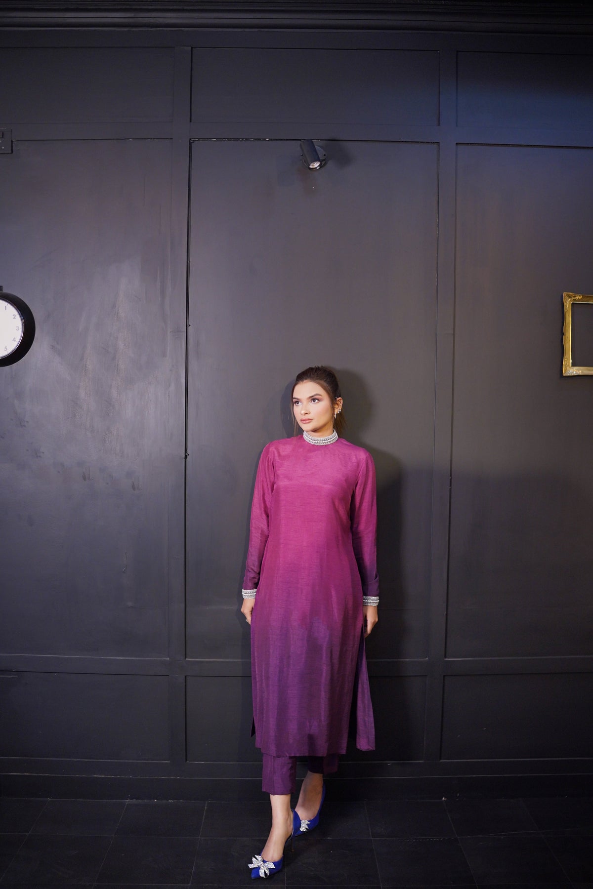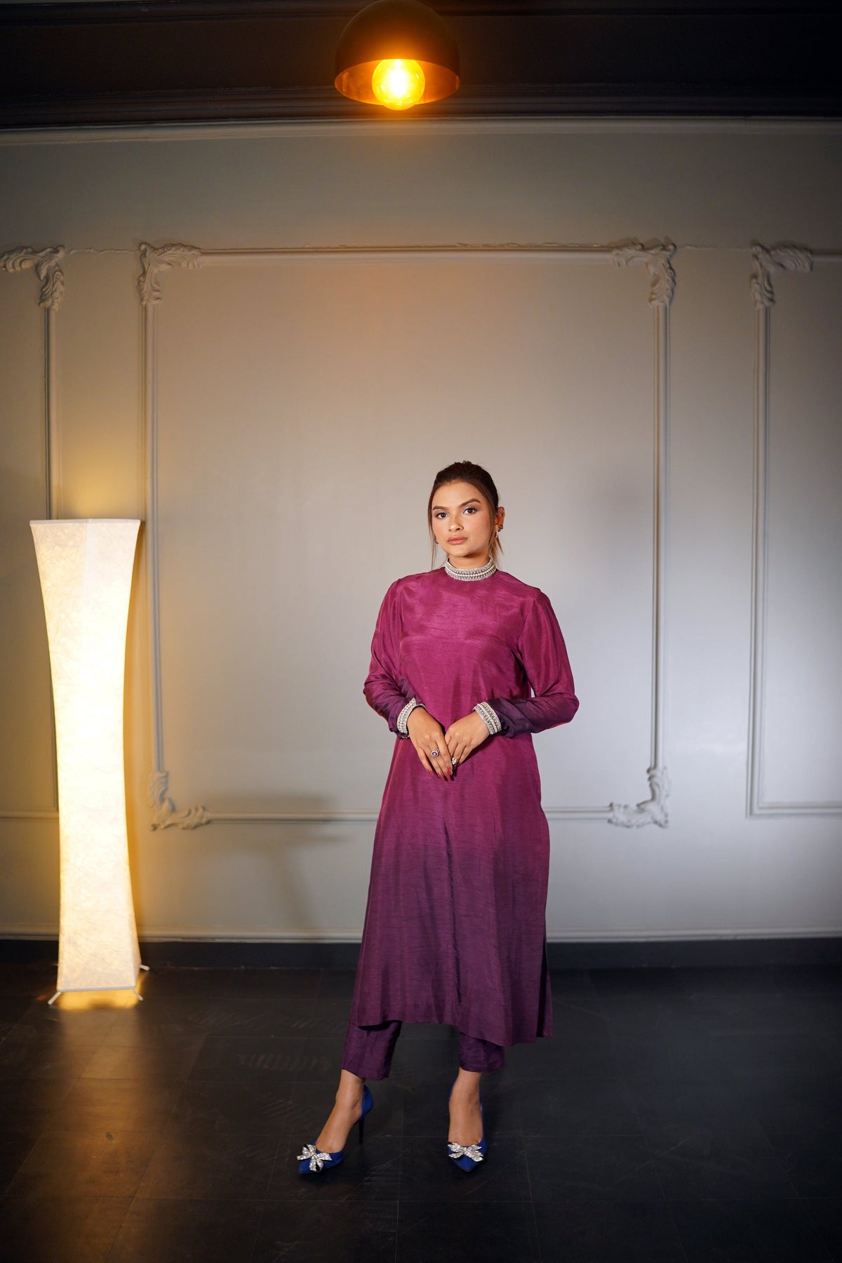 Let's get dive into the plum perfection with its stunning look and embellished sleeves details. This beautiful outfit shows a rich rendering of Magenta and violet shades into a high neck embellished shirt with straight pants.