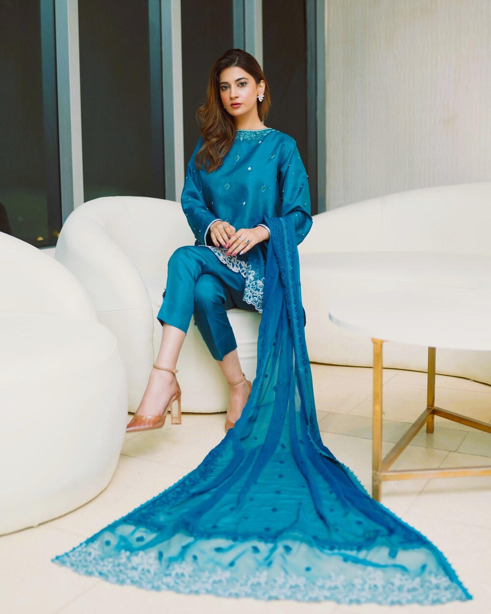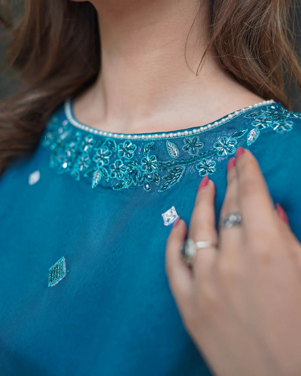 Draped in elegance: Silver on Teal. From intricate contemporary Dabka work to cut-out hem details, each stitch tells a story of timeless style. Handcrafted Tussles at the back and the touch of Naqshi, crystals, and pearls – which ensemble steals your heart?