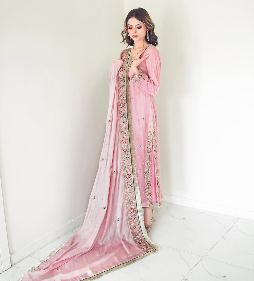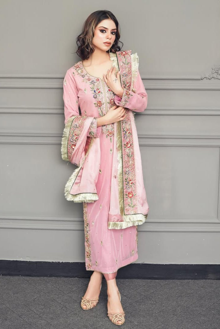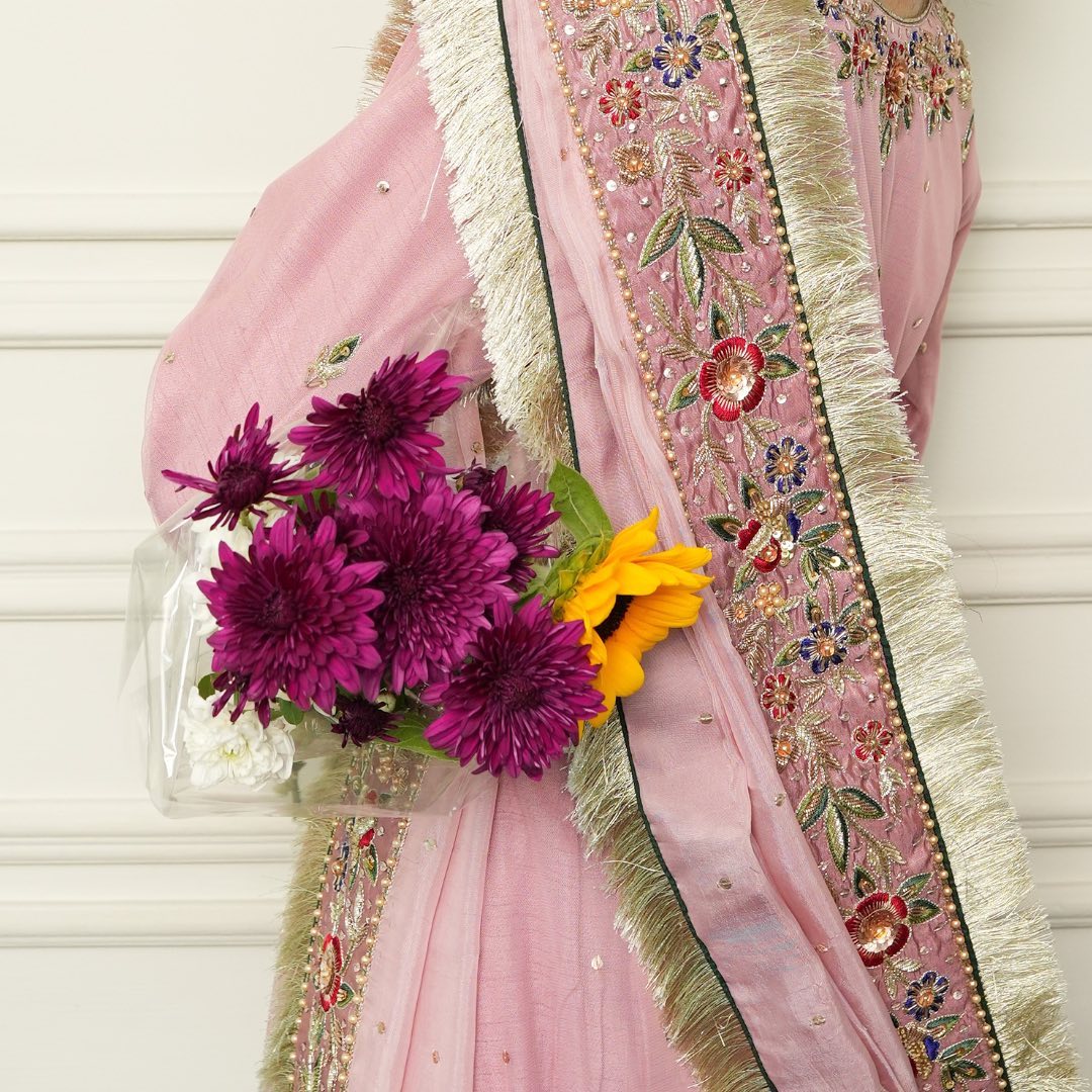 Experience timeless elegance with this exquisite ensemble, showcasing the refined artistry of traditiona craftsmanship. The soft powder pink net shirt boasts intricate Resham and sequin embroidery, forming delicate floral patterns that shimmer with every movement. Completed by a luxurious silk dupatta and ornate floral chatta, this masterpiece is a treasured addition to your festive wardrobe.