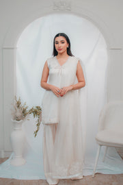 The kameez features an elegantly structured silhouette, enhanced by an embellished neckline and intricately adorned border, lending the ensemble a sense of regality and understated opulence. Its serene white palette adds versatility, making it equally perfect for day festivities or evening soirees.