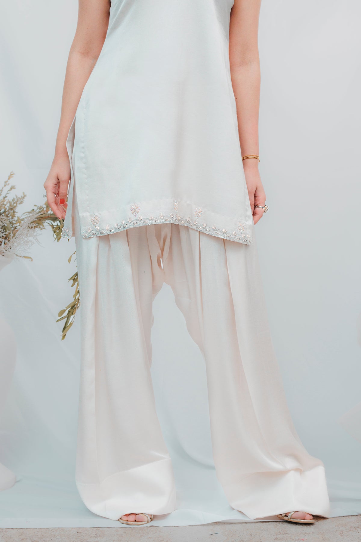 Step into timeless elegance with Gul-e-Safaaid – "The White Blossom", a gracefully composed Farshi Shalwar Set that embodies purity, poise, and refined femininity. Crafted from premium charmeuse silk, the fabric drapes like liquid luxury, casting a soft, luminous glow with every movement.