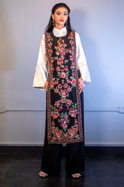 Raizel, A 3pc outfit. It features enchanted rose motifs and sequins work. It paired with inner Charmeuse silk shirt and italian crepe pants. Raizel, is indeed a beautiful representation of fantasy and fashion with sparkling look.