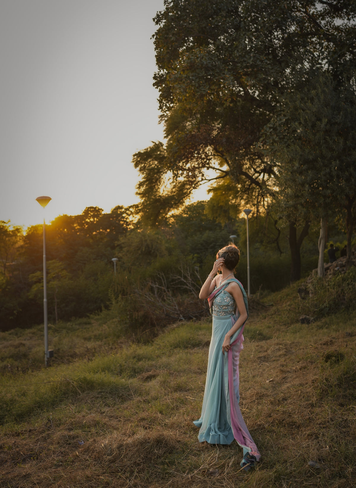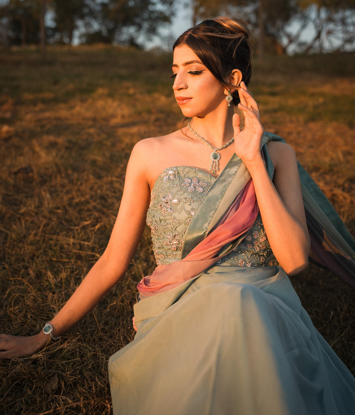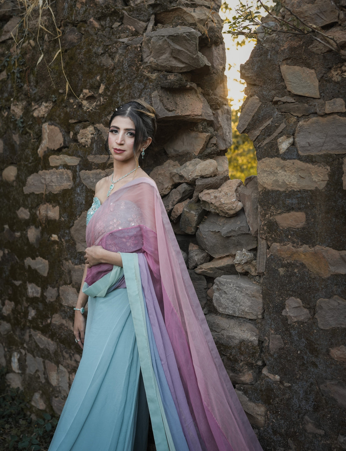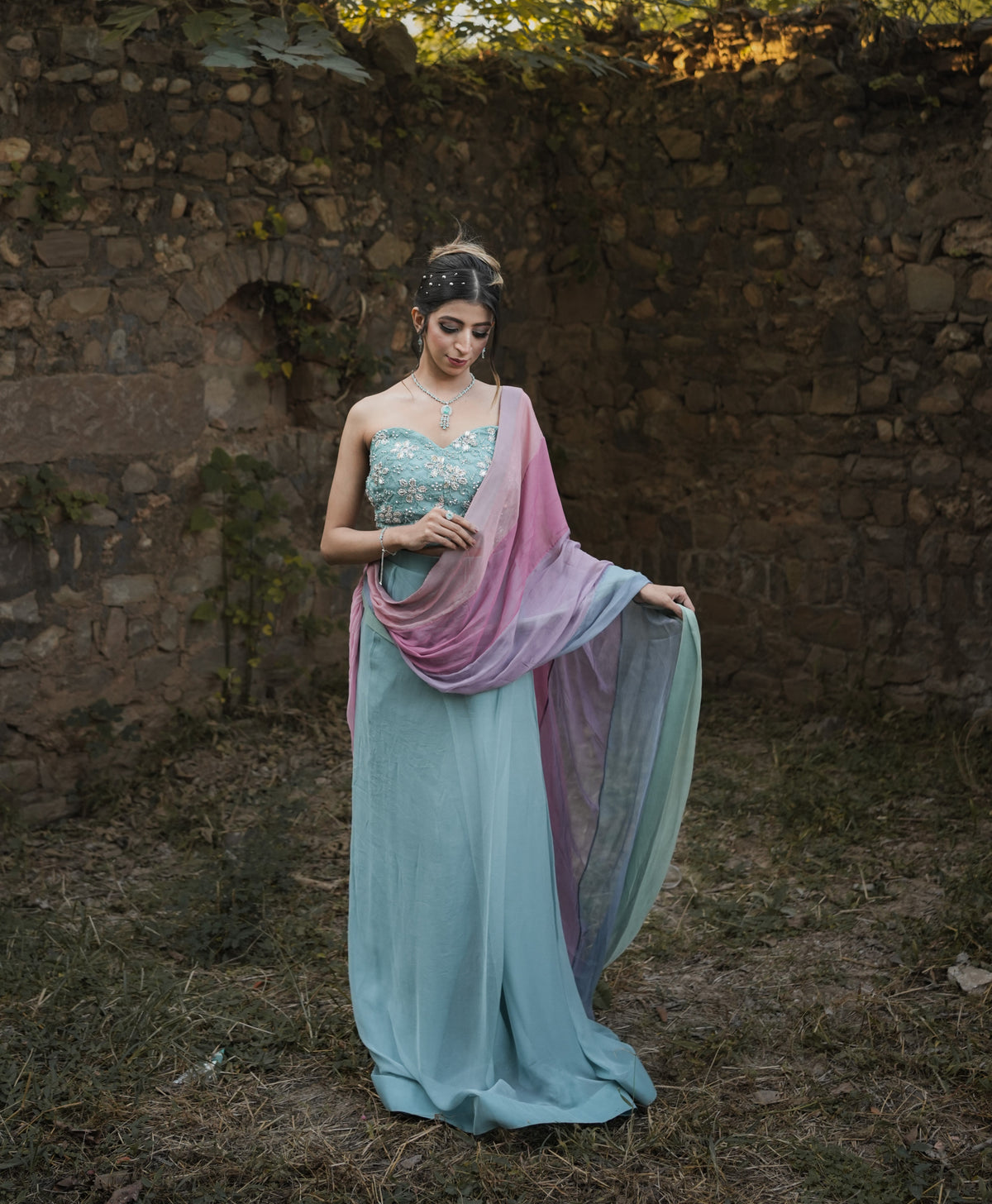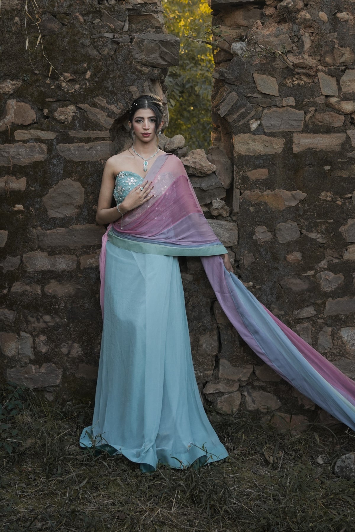 The Vanya saree is a stunning pastel blue ensemble featuring a strapless blouse with intricate floral embroidery. Its flowing drape is complemented by a translucent pink-to-purple gradient pallu, adding an ethereal touch. Elegant and modern, the saree embodies timeless charm with a contemporary twist.