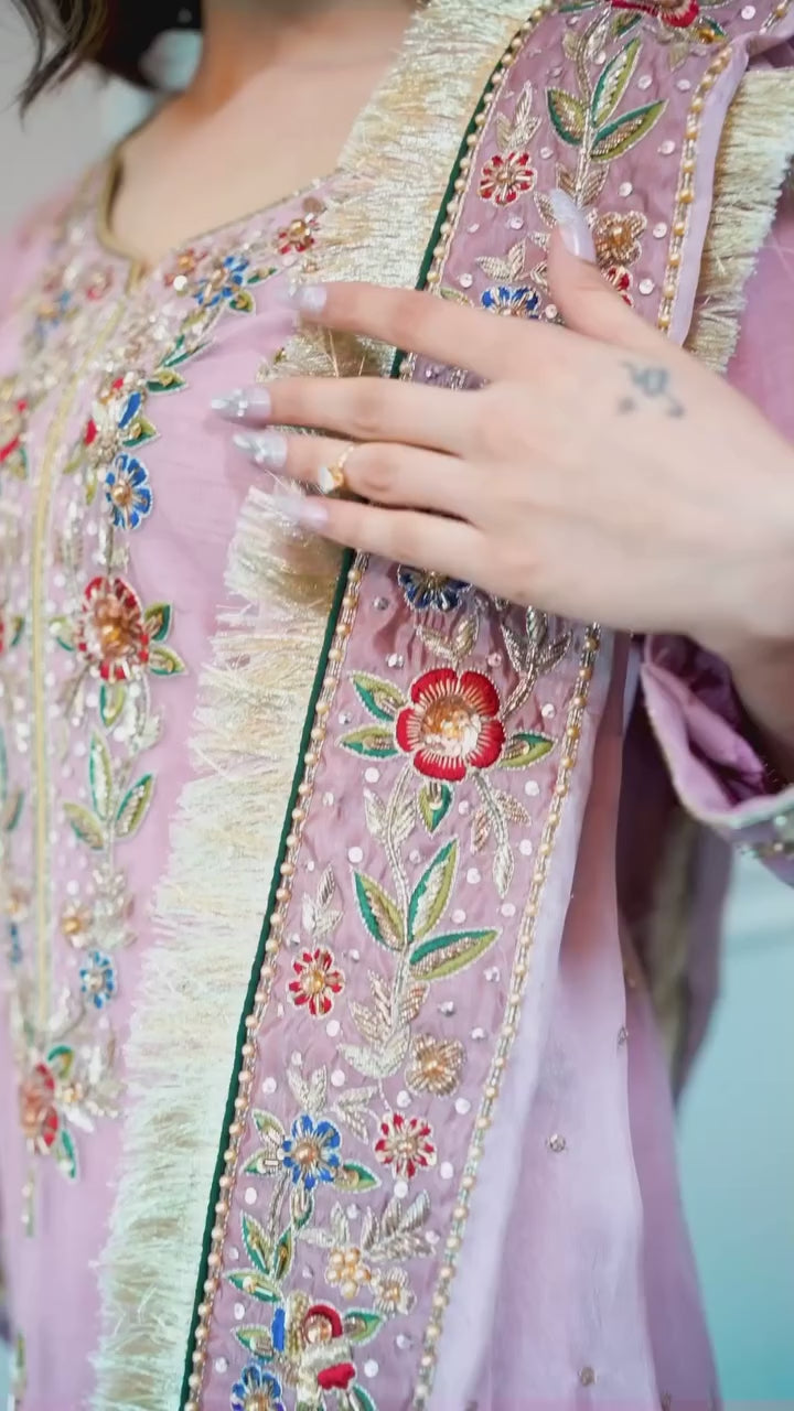 The soft powder pink net shirt boasts intricate Resham and sequin embroidery, forming delicate floral patterns that shimmer with every movement.
