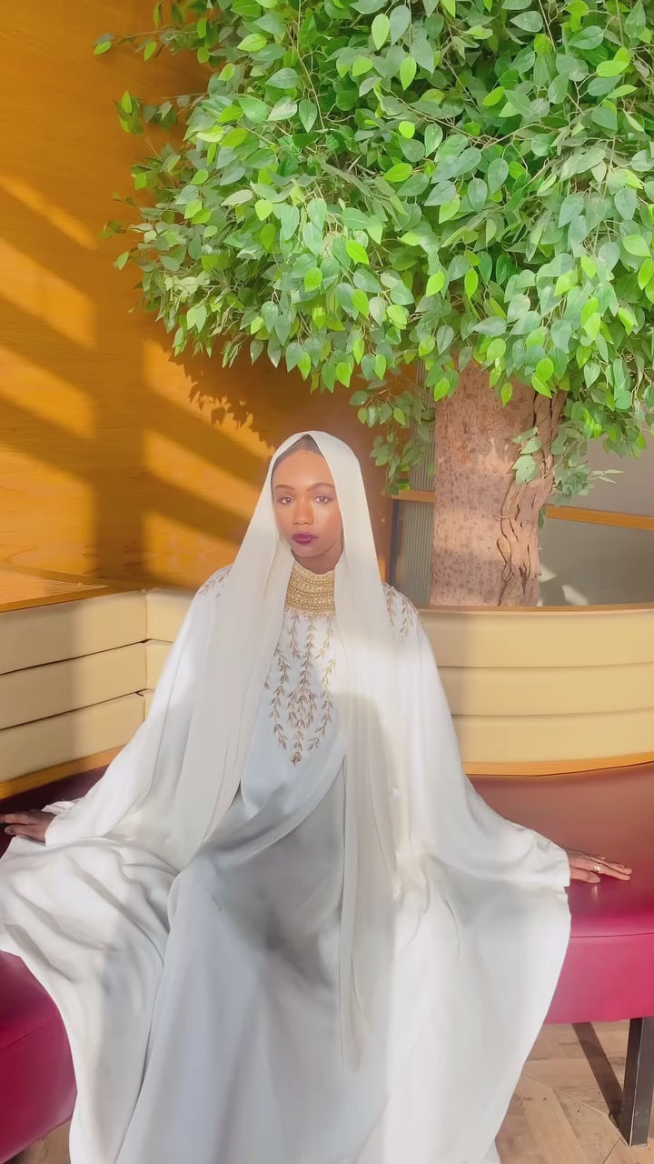 This kaftan dress, made from luxurious shamose silk, features a flowing silhouette and intricate gold embroidery on the neckline. Its sleek design and rich details create an elegant and timeless look.
