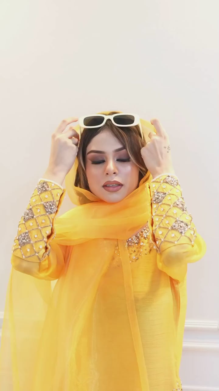 This vibrant yellow ensemble, adorned with intricate pearl and katana details, combines a modern silhouette with classic fusion.
